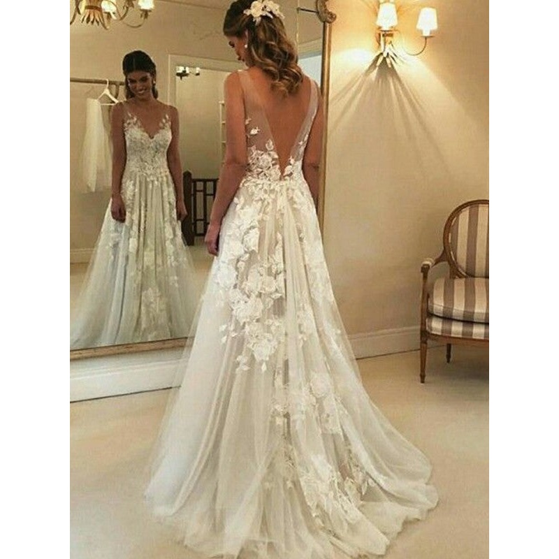 A-Line/Princess V-neck Sleeveless Sweep/Brush Train Applique Tulle Wedding Dresses
