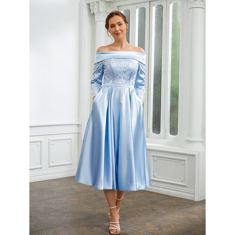 A-Line/Princess Woven Satin Ruched Off-the-Shoulder Long Sleeves Tea-Length Mother of the Bride Dresses