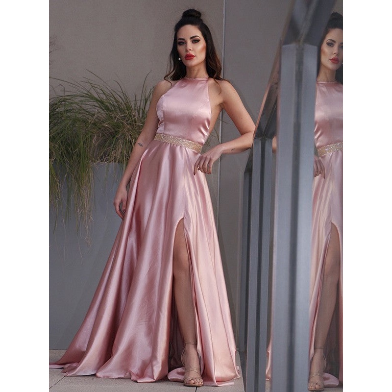 Be the first to review “A-Line/Princess Woven Satin Ruffles Halter Sleeveless Sweep/Brush Train Dresses”