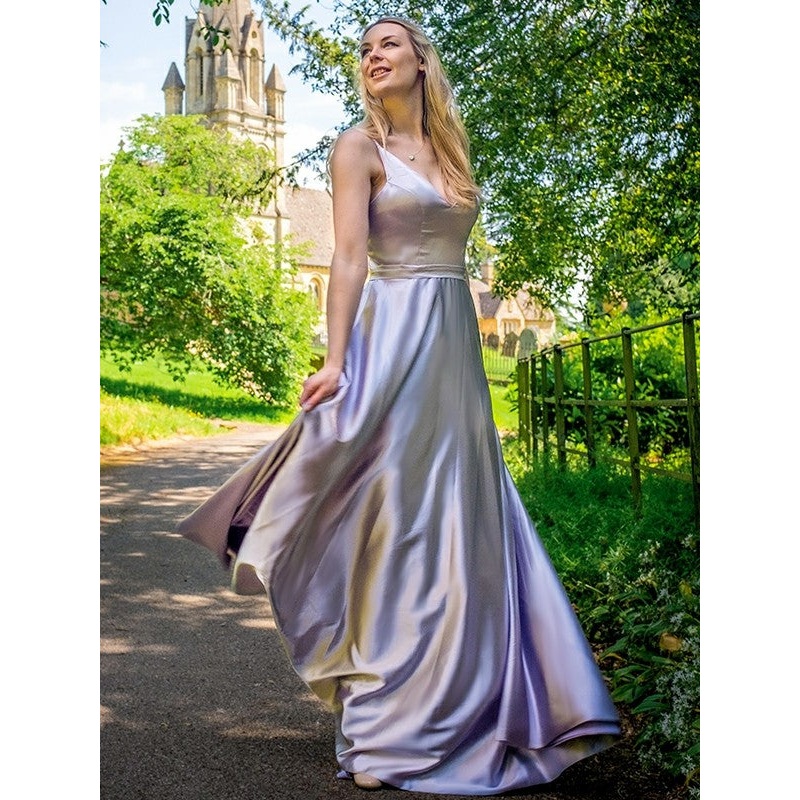 A-Line/Princess Woven Satin Ruffles V-neck Sleeveless Floor-Length Dresses