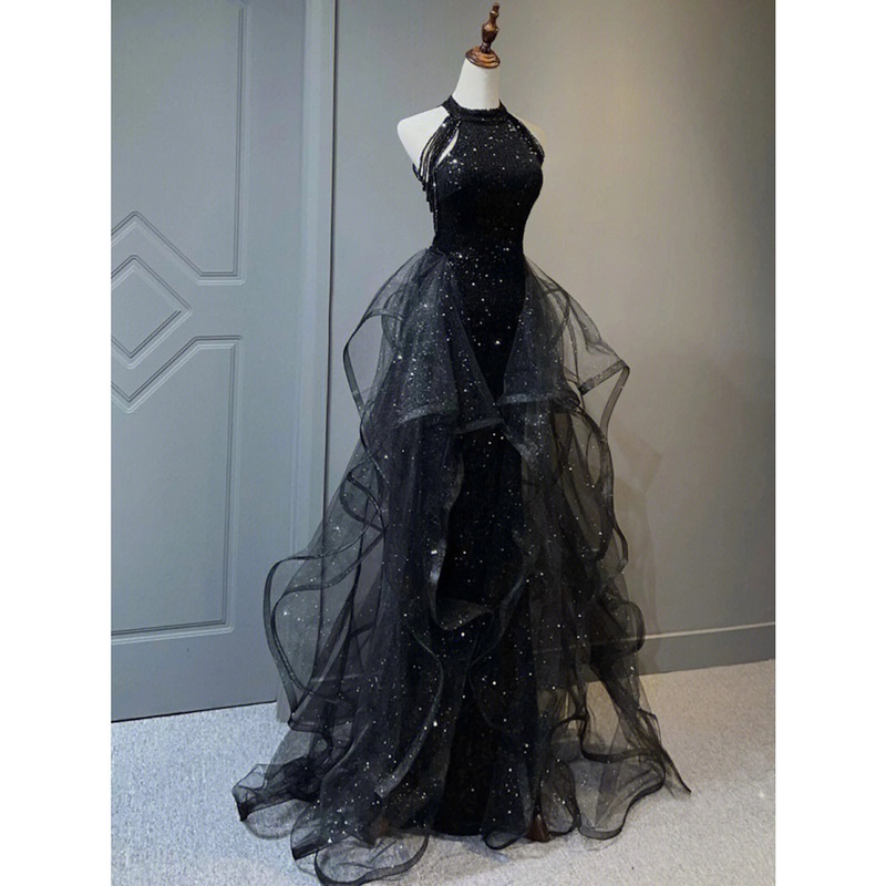 A-Line Prom Black Dress Vintage Dress Wedding Party Birthday Sweep / Brush Train Sleeveless Halter Neck Wednesday Addams Family Sequined with Crystals Sequin Ruffles