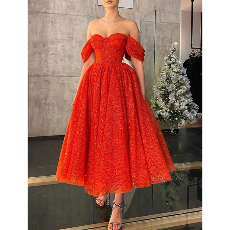 Be the first to review “A-Line Prom Dresses Corsets Dress Wedding Party Birthday Tea Length Sleeveless Off Shoulder Tulle with Glitter Sequin” Cancel reply