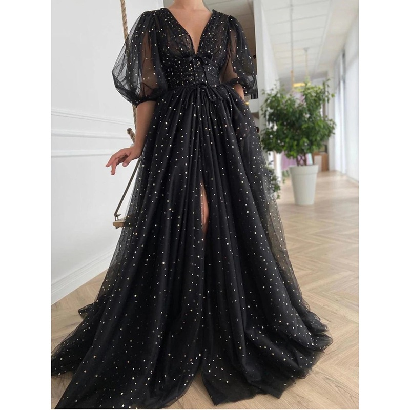 A-Line Prom Dresses Elegant Dress Wedding Guest Prom Court Train Half Sleeve V Neck Wednesday Addams Family Tulle V Back with Bow(s) Sequin Slit