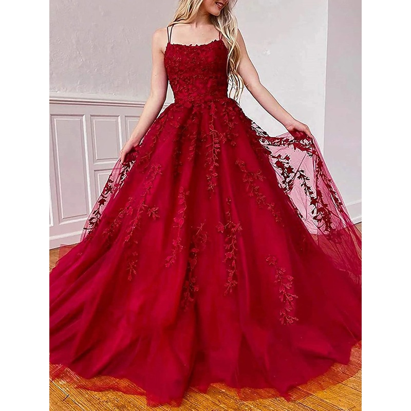 A-Line Prom Dresses Floral Dress Formal Wedding Guest Chapel Train Sleeveless Spaghetti Strap Tulle with Appliques