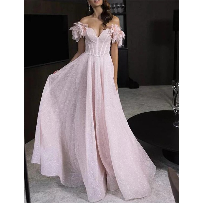 A-Line Prom Dresses Glittering Dress Prom Birthday Floor Length Sleeveless Off Shoulder Tulle with Glitter Crystals