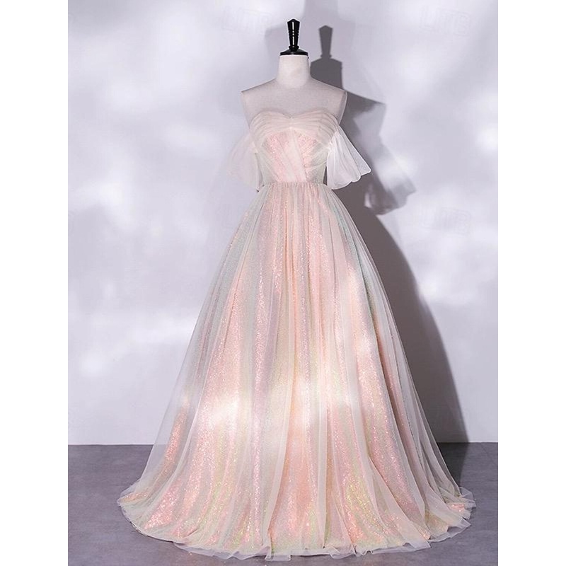 A-Line Prom Dresses Glittering Dress Quinceanera Birthday Floor Length Short Sleeve Off Shoulder Tulle with Ruched