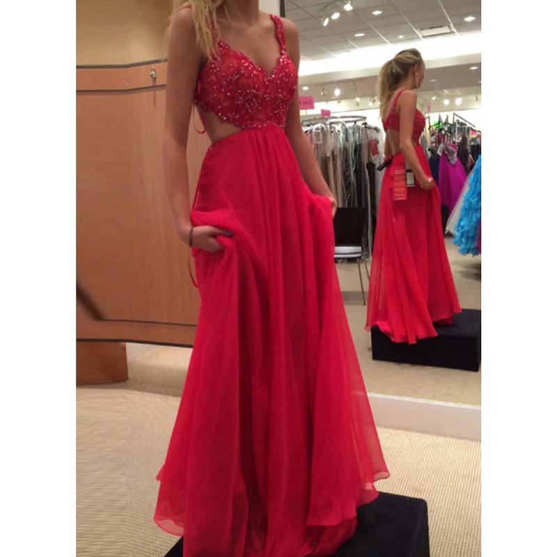 A-Line Prom Dresses Open Back Dress Formal Prom Floor Length Sleeveless V Neck Chiffon Backless with Beading