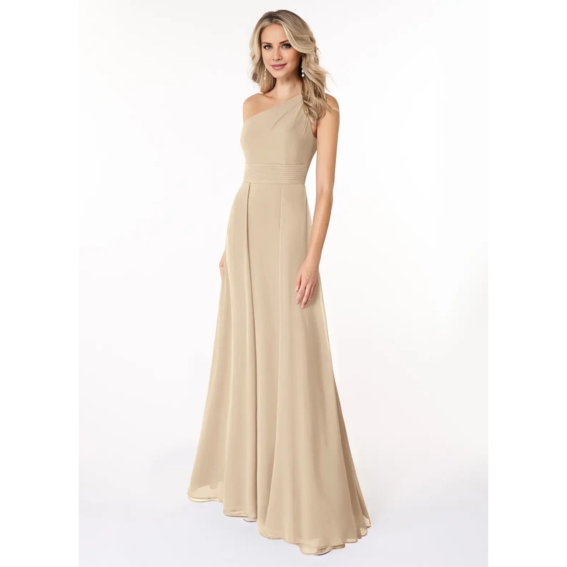 Length :Floor-LengthFabric :Chiffon (Non-Stretch)Silhouette :A-Line/Princess, A-LineSleeves :SleevelessNeckline :One-ShoulderBack style :Side ZipEmbellishment :PleatedFeatures :With Pads, With Boning, Without Leg Slit
