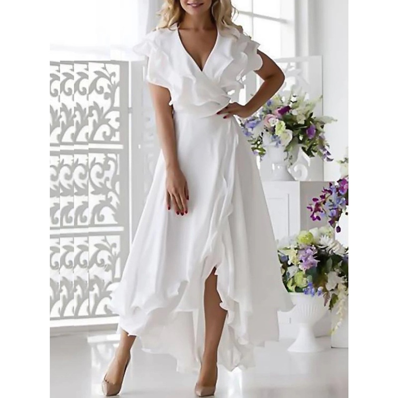 A-Line Simple Wedding Dress Little White Dress Elegant High Low V Neck Plus Size Asymmetrical Chiffon Short Sleeve with Ruffles Split Front