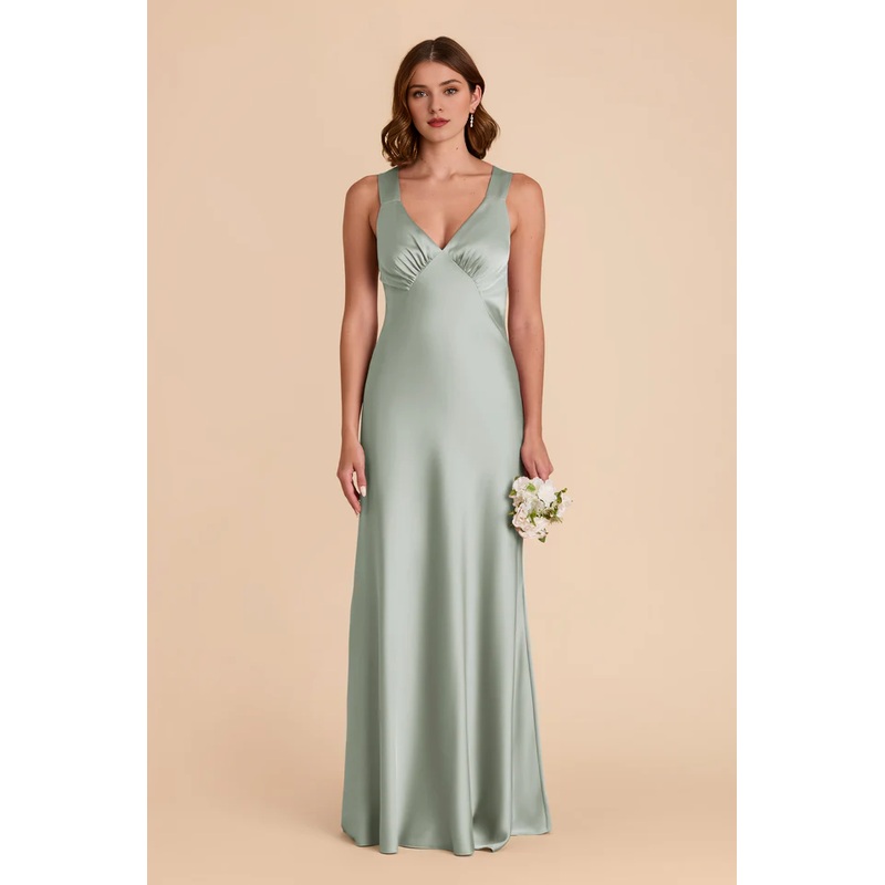 A-line skirt with crossed back and deep V-shaped matte satin bridesmaid dress