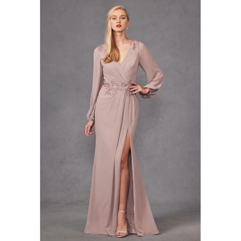 A-line slit skirt embroidered long sleeved dress