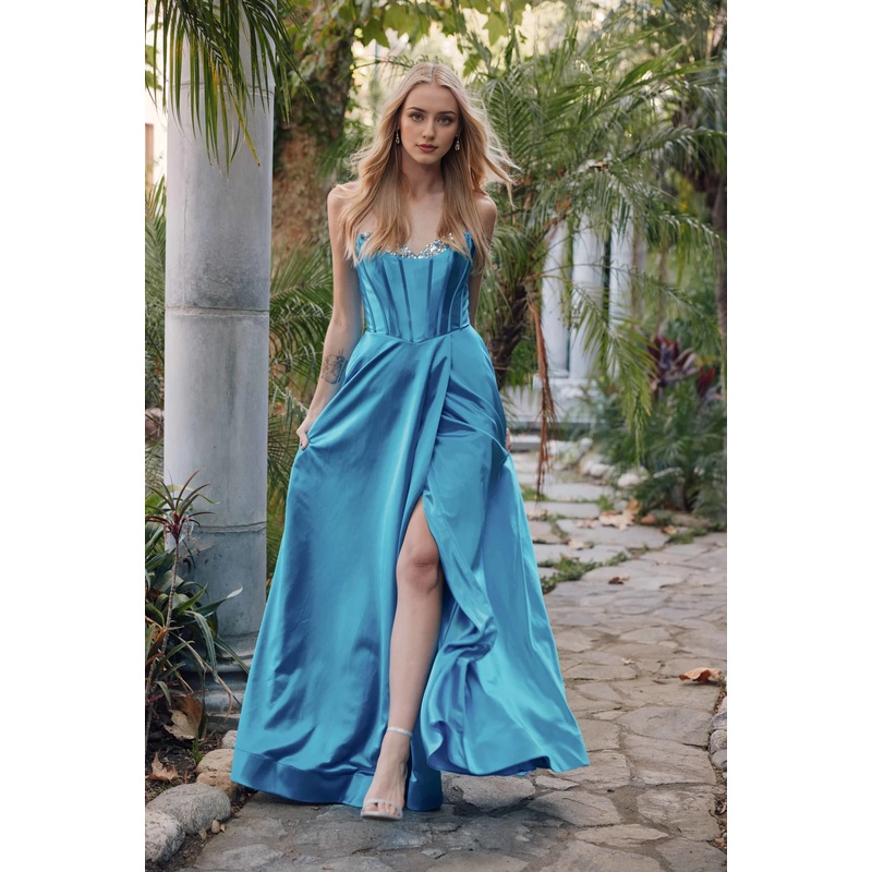 A-line slit skirt with bead embellishment long strapless dress
