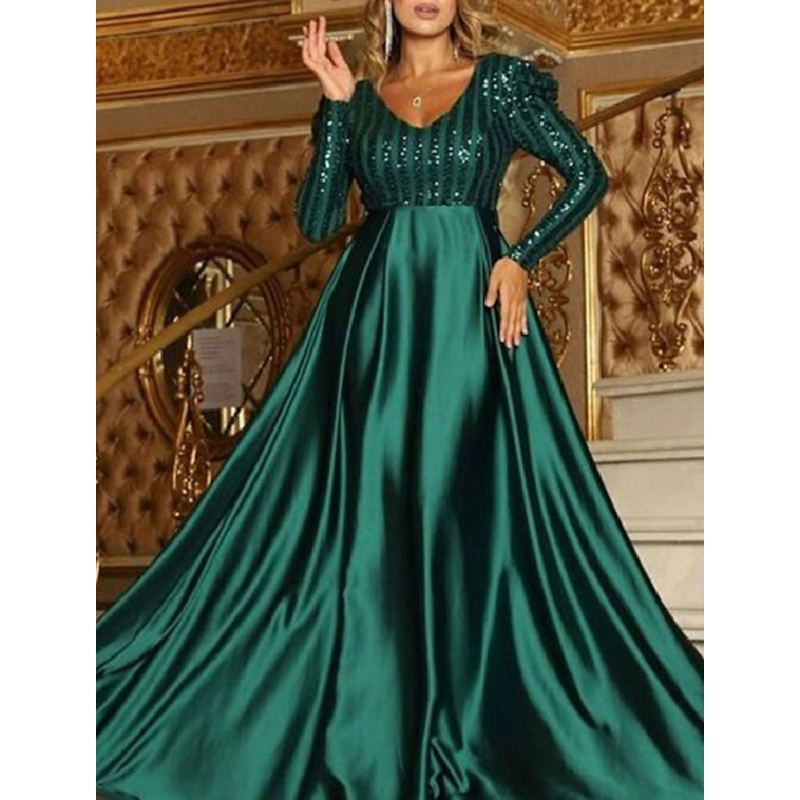 A-Line Sparkly Engagement Formal Evening Red Green Dress V Neck Long Sleeve Court Train Polyester with Sequin