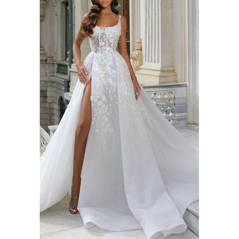 A-line Square Neck Lace Applique High Split Palace Trail Countryside Style Wedding Dress
