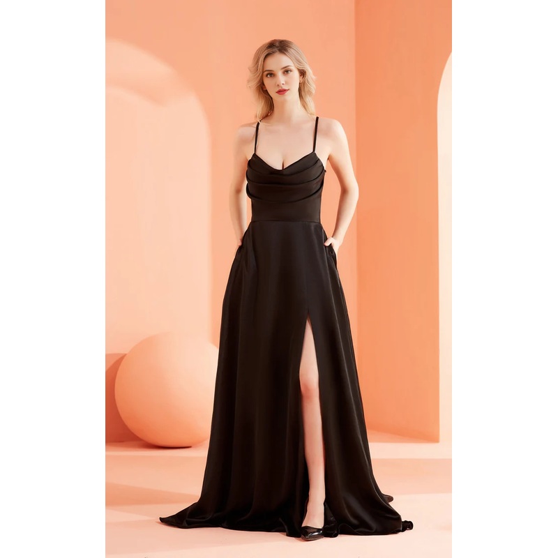 A-line square neckline sleeveless thin shoulder strap with side slits and floor length Prom dress
