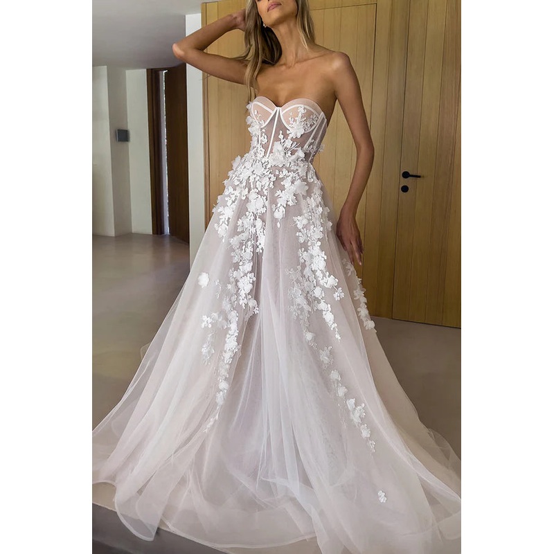 A Line Sweetheart Lace Applique Bohemian Wedding Bridal Dress