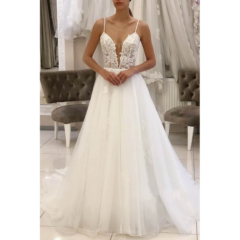 A-line thin shoulder straps, thin gauze stickers rural style wedding dress
