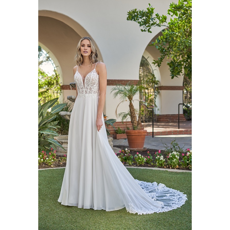 A-line tight corset with beaded thin shoulder straps and floor length wedding dress