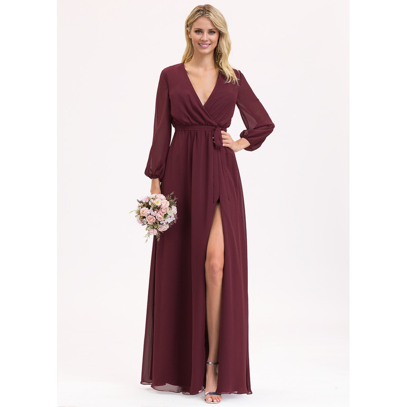 A-Line V-Neck Floor Length Chiffon Bow Pleated Bridesmaids Dress