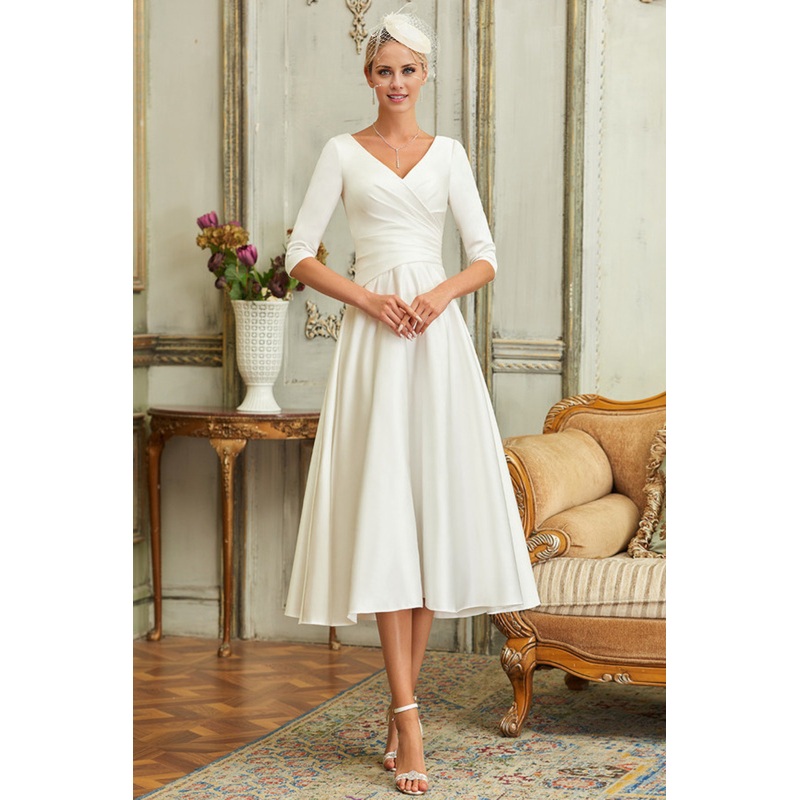 A-line V-neck tea 3/4 sleeve satin wedding dress
