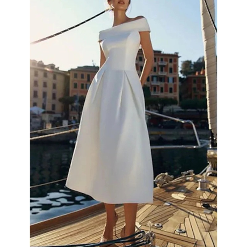 Be the first to review “A-Line Wedding Guest Dresses Elegant Dress Wedding Party Birthday Tea Length Short Sleeve Off Shoulder Satin with Pure Color”