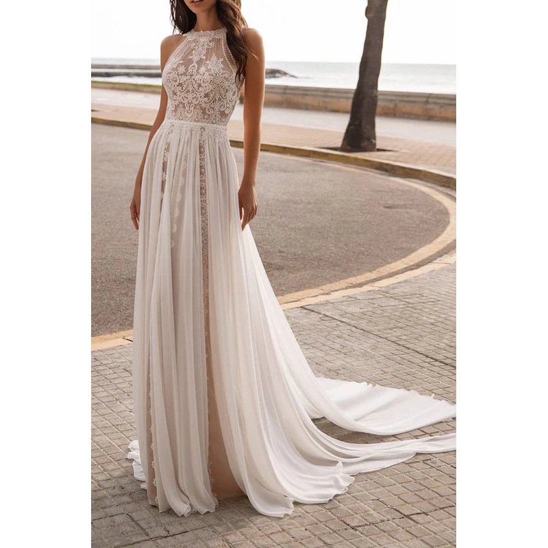 A-shaped gemstone neckline lace bohemian wedding beach bride dress
