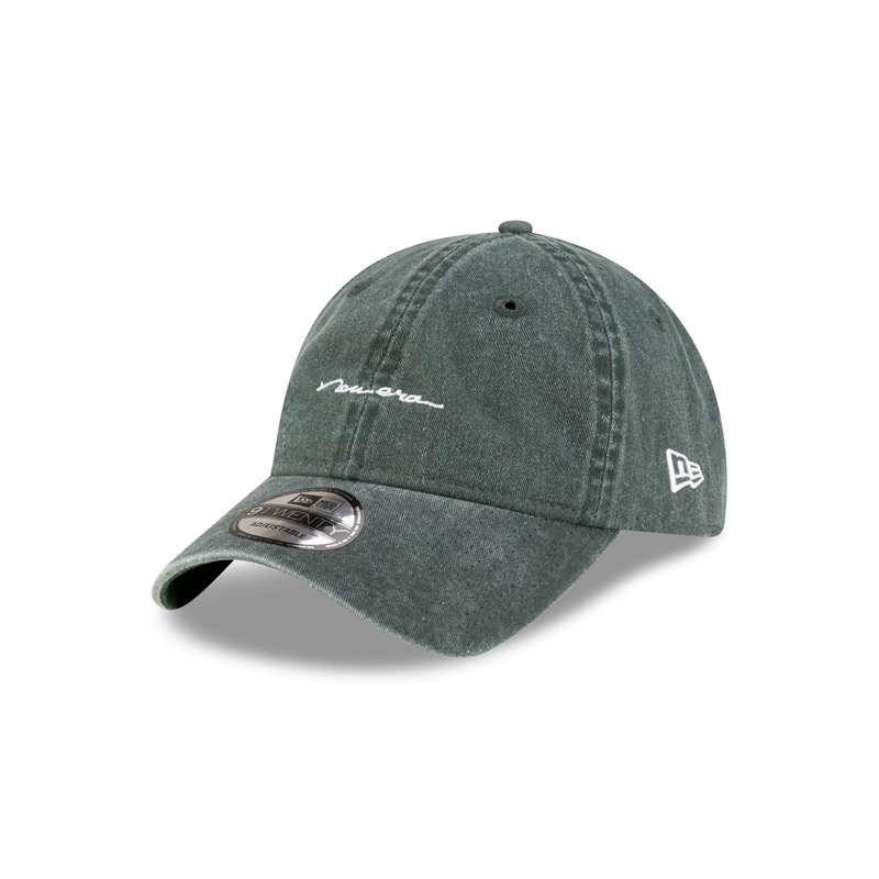 The Acid Wash Handwritten 9TWENTY Adjustable Hat features an embroidered New Era script at the front panels with an adjustable D-Ring closure at the rear and a green undervisor.