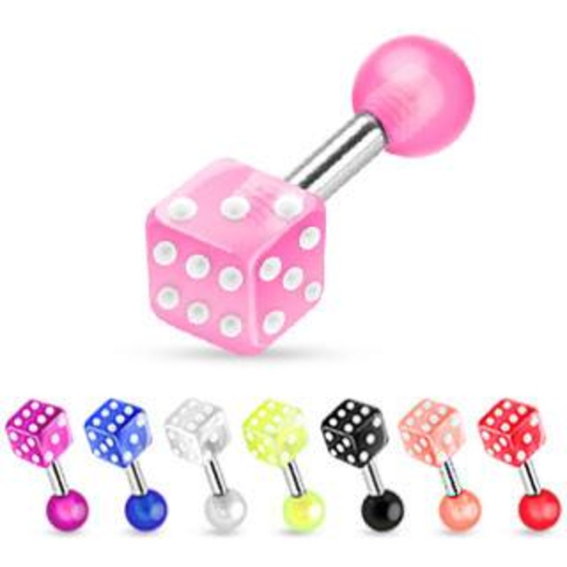 The 16 gauge cartilage barbell is made from externally threaded 316L stainless steel. Both 4x4mm acrylic dice and ball ends are removable.