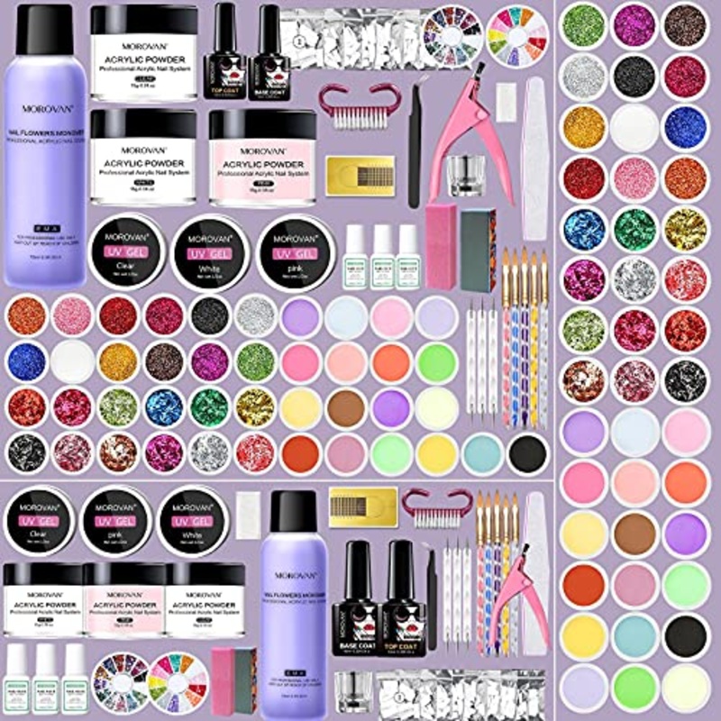 Acrylic Nail Kit with Acrylic Powder and Nail Art Tools NailMorovan acrylic powder and liquid set Included 3 basic acrylic powder 0.5oz, acrylic liquid 2.5oz monomer, nail glue, glitter, nail tips, acrylic nail brush, rhinestones, and other basic nail tool