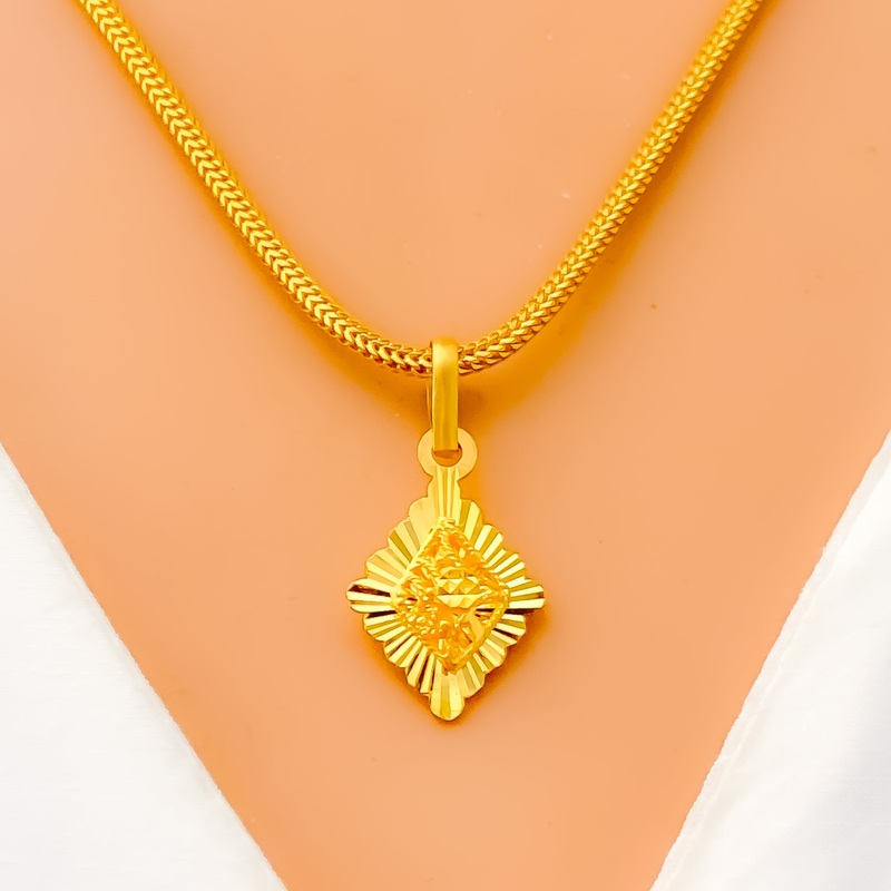 Exuding elegance and brilliance, this 22k yellow gold pendant features a beautifully adorned design that enhances its radiant appeal. Weighing 1.7 grams, its polished gold finish highlights the intricate craftsmanship, creating a timeless and sophisticated