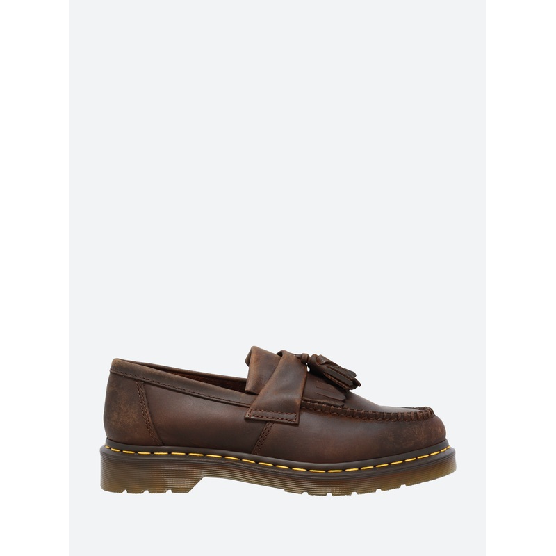 Dr. Martens Adrian with a double tassel and kiltie fringe, the traditional slip-on loafer has been a classic since day one.Slip-on styleDouble tassel and kiltie fringeYellow stitchingAir-cushioned soleGoodyear weltedMaterialsUpper smooth leatherOutsole: PV