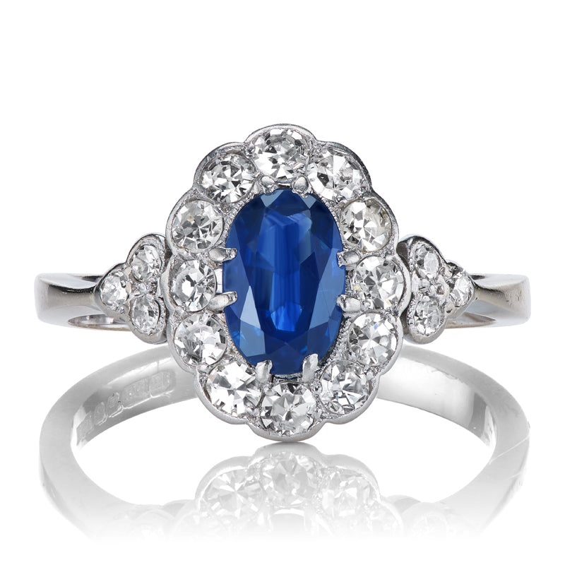 Antique Sapphire Ring with Diamond Halo in Platinum Setting