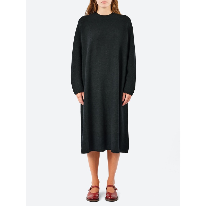 Crafted from a soft wool jersey, this Pas de Calais dress offers a relaxed silhouette with a crew neckline, long sleeves and a midi-length hem. Design details include rolled-up edges at the hemline, neckline, and cuffs, adding subtle texture and a relaxed
