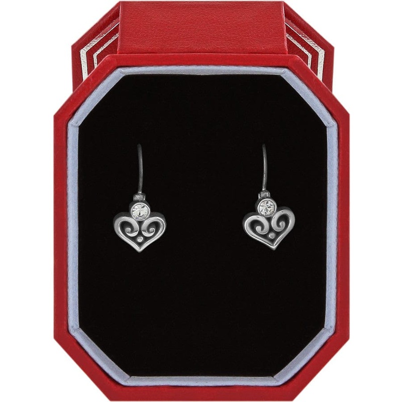 Featuring fine quality crystals atop swirly filigree hearts, these sweet silver-plated earrings are perfectly in every way. Box sets make great gifts!