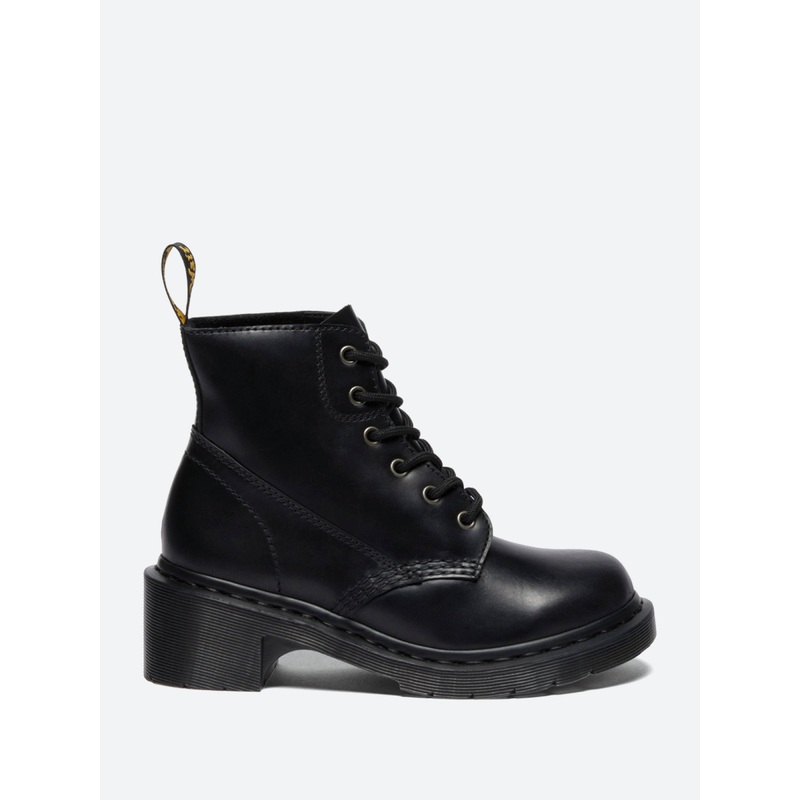 A redefinition of a classic. With lifted form and laced-up detailing, the Alderstone 6-eye boot takes on a more commanding shape. Crafted with Orleans leather thats known for its smooth look and relaxed feel. Fitted with antique silver eyelets, black laces and monochrome stitching. Welted with black stitching, the boot is finished with a smoke PVC outsole for extra height.
