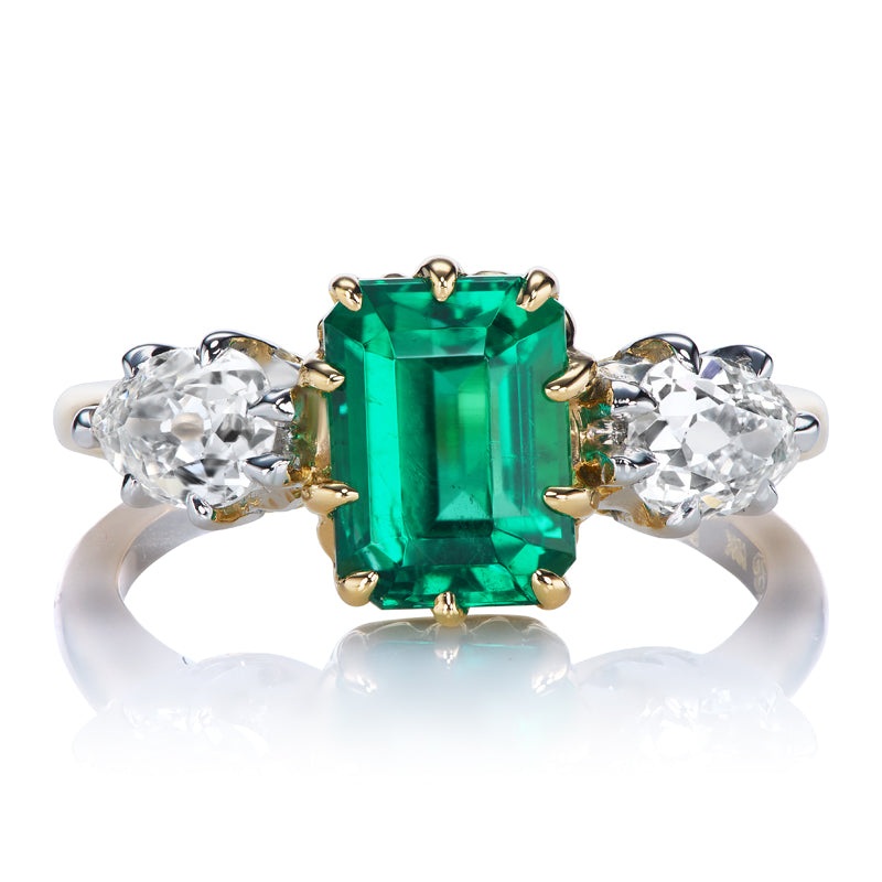 Emerald and Pear Cut Diamond Three Stone RingThe Alfie 1.88 ring is an AB original design made right here in NYC. The ring centers a C-Dunaigre certified 1.88 carat Emerald Cut Zambian Emerald with minor enhancement. One Pear cut diamond is set to each sid