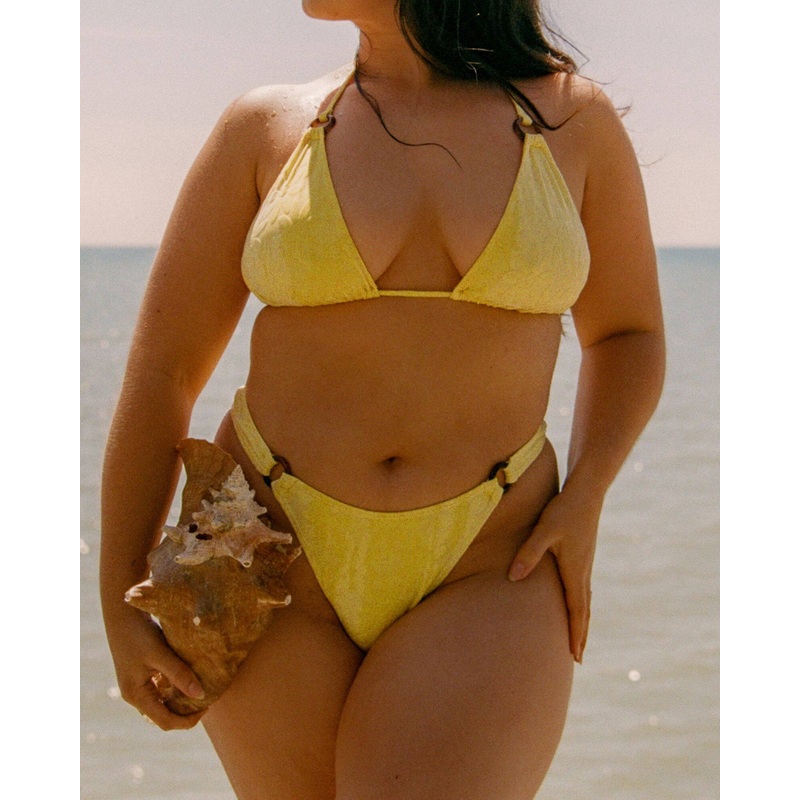 Our Alfred bikini bottom is designed to offer a mid-rise fit. It's one of the most flattering bottoms we have. The tanga cut provides a very sexy look and offers nice tan lines.DetailsShell:Lining: 80% nylon and 20% spandexColor: YellowCoverage: TangaMid-r