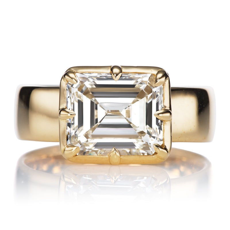 East-West Set Emerald Cut Diamond Collet Set in Chunky Yellow Gold SettingThe Allie 2.88 ring is an AB original design made right here in NYC. The ring centers a GIA-certified 2.88 carat Emerald Cut diamond of K color, VS1 clarity. The stone is East-West s