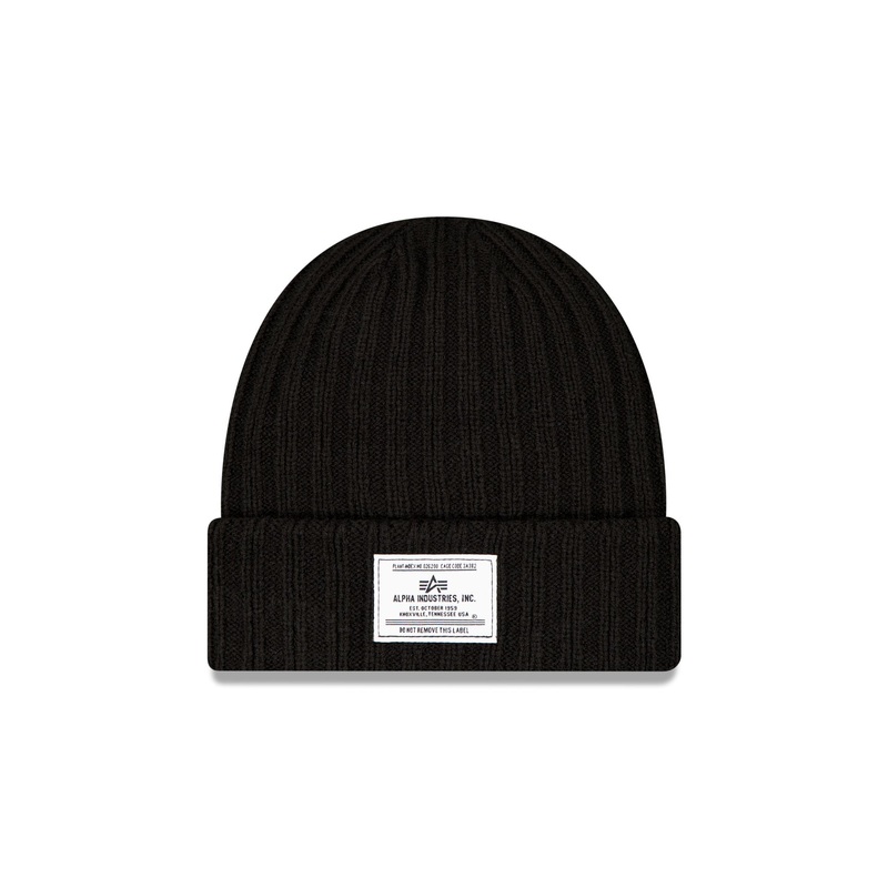 The Alpha Industries x New Era Black Cuff Knit features a woven Alpha Industries, Inc. label at the front with an embroidered New Era Flag at the left-wear side.