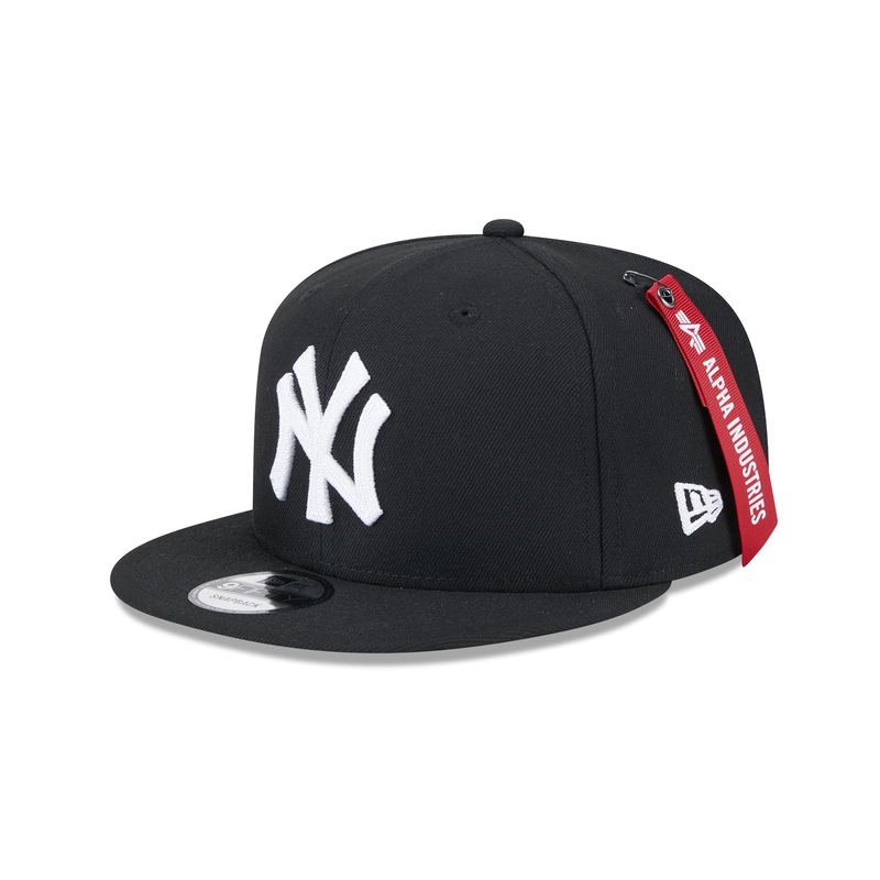 The Alpha Industries x New York Yankees Black 9FIFTY Snapback features a chainstitch embroidered Yankees logo at the front panels with an alternate team logo at the right-wear side, a signature Alpha Industries red ribbon at the left-wear side, and a snapback closure at the rear.