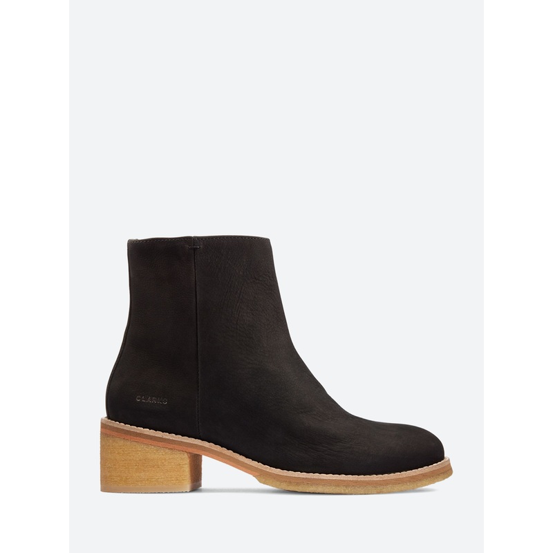 An understated ankle boot, Clarks Originals Amara Crepe teams sustainably crafted Forest Stewardship Council-certified crepe sole with a sleek, minimally stitched tan suede upper. Its mid-rise crepe heel adds an elegant lift and the inside zip makes it an