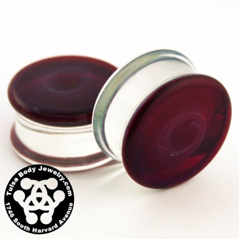 These double flare amber/purple color front plugs are made from hand blown borosilicate glass by Glasswear Studios. They have a wearable area of approximately 3/8" between flares. Choose your size below.