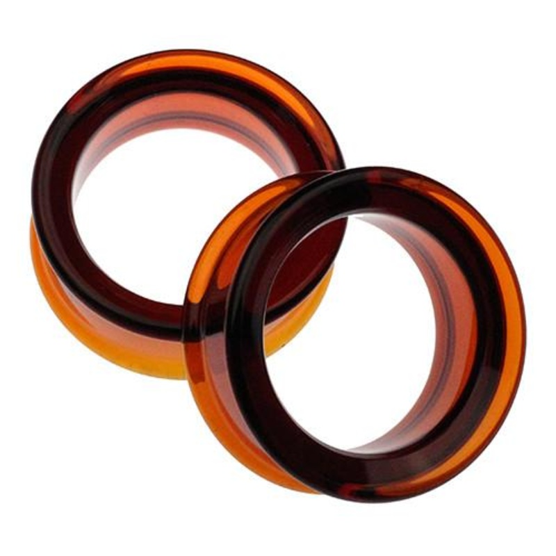 These double flare amber tunnels are made from hand blown borosilicate glass by Glasswear Studios. They have a wearable area of approximately 1/2″ between flares. Choose your size below.