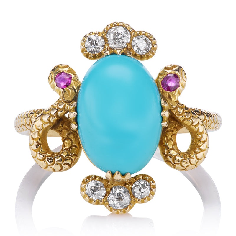 Antique Victorian Turquoise, Diamond, and Ruby Snake Ring