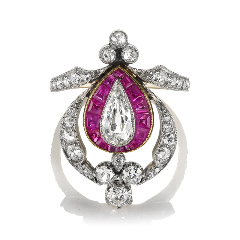 Art Nouveau Ruby and Diamond Ring with Pear Cut Diamond