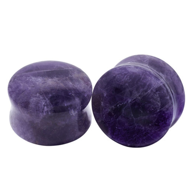 These double flare amethyst plugs are made by Diablo Organics. They're rounded on one side and flat on the other with a wearable area of 7/16" between flares. Choose your size below.