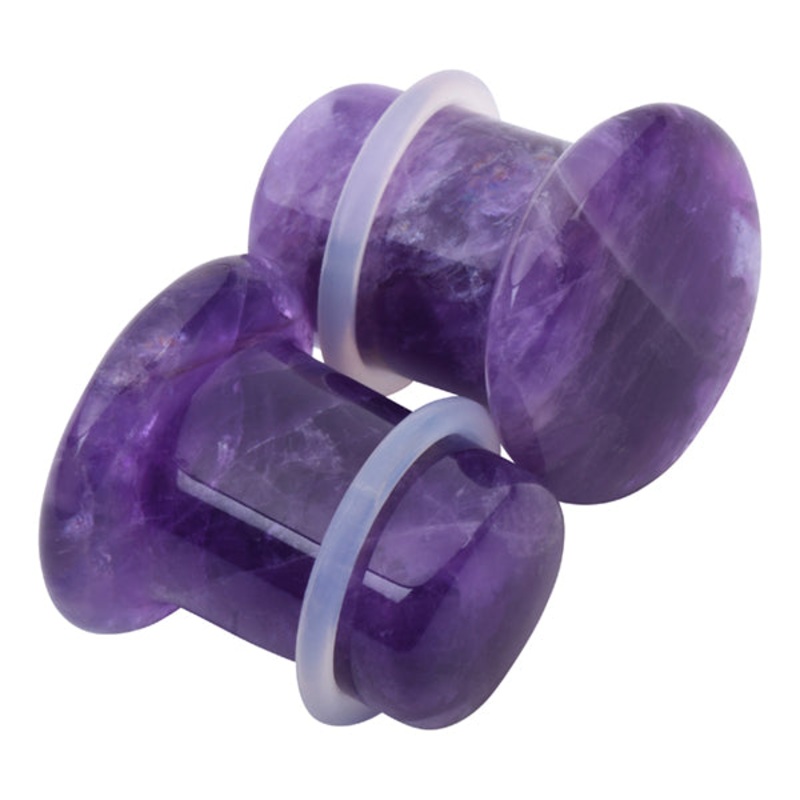 These single flare amethyst plugs have a wearable area of 3/8" between the o-ring and flare. Two clear silicone o-rings are included. Amethyst is a purple variety of quartz and February birthstone. Ancient Greeks believed it could protect the wearer from i