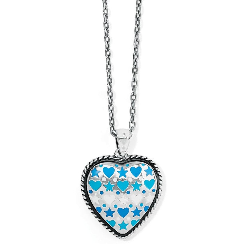 Hearts-within-a-heart give a graphic punch to this hand-enameled pendant blue necklace thats perfect to wear with summer whites and denim, or all year round.
