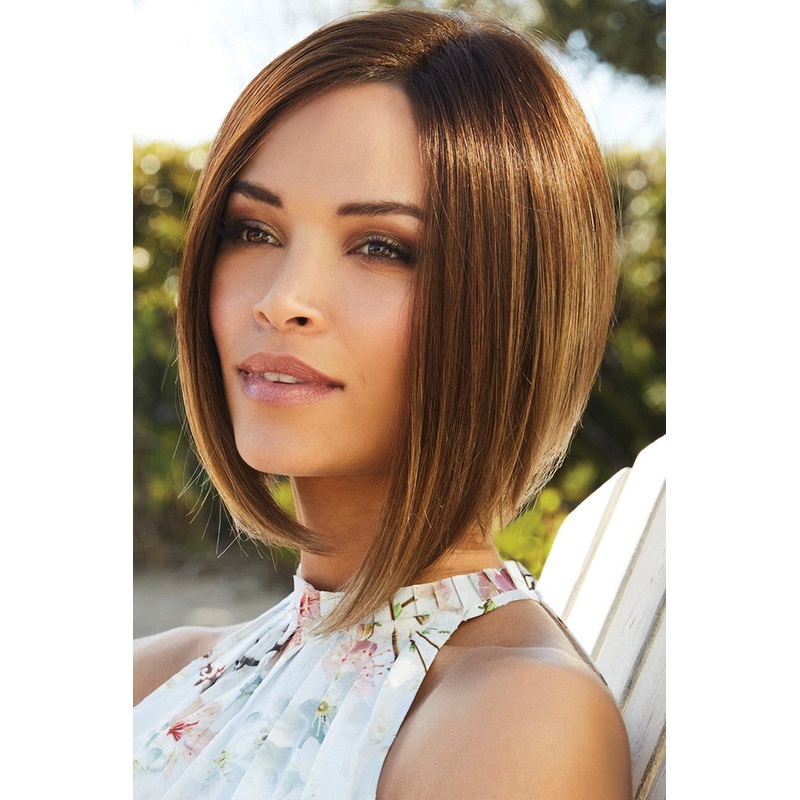 Dramatic a-line bob with a long fringe and tapered nape. Offers top hair ventilation with extended lace and soft/airy net. Wefts sewn onto soft, light breathable material.