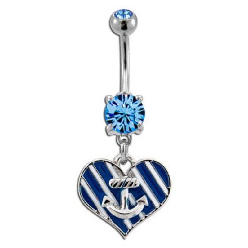 The 14 gauge anchor heart dangle belly barbell is made from externally threaded 316L stainless steel. Only the 5mm ball end is removable.